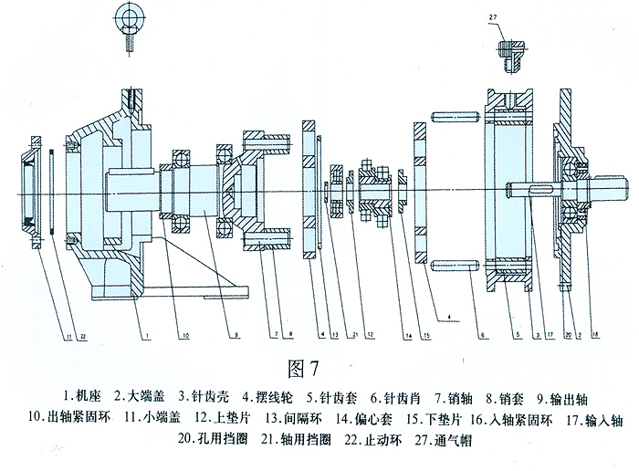 我公司生产的各种类型摆线针轮减速机内部结构相同,因此其拆卸与装配工艺基本一样,拆卸前应首先放尽润滑油,立式减速机须先拆除油泵,拆装顺序图7。